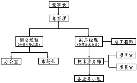 公司組織構(gòu)架設(shè)置為一辦兩部,即辦公室、市場(chǎng)部、技術(shù)業(yè)務(wù)部。技術(shù)業(yè)務(wù)部下設(shè)項(xiàng)目室和質(zhì)量室,并設(shè)置若干業(yè)務(wù)小組。